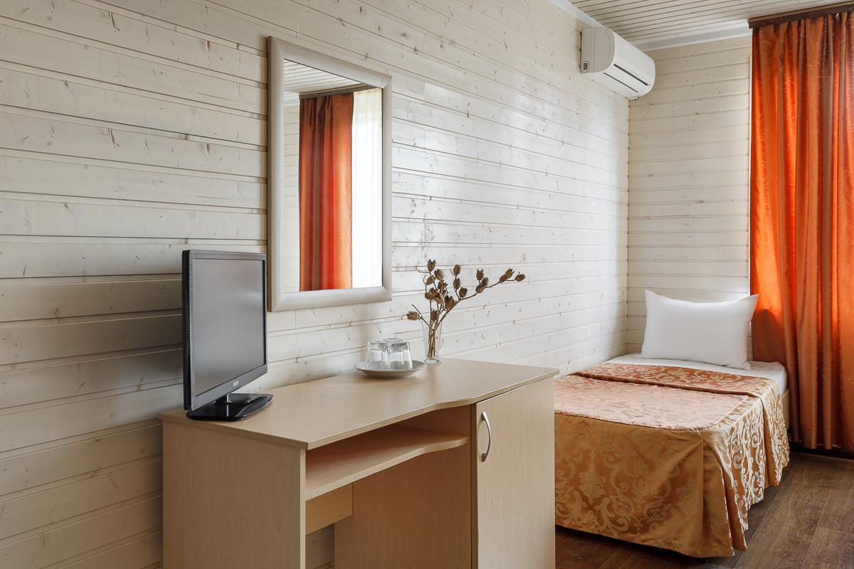 Площадь номера - 19 кв.м. 3 осн. места. 1 доп. место. Мебель: вешалка, зеркало, кровати односпальные /одна двуспальная кровать (и одна односпальная кровать), прикроватные тумбочки, стол, стулья, шкаф. Оборудование: кондиционер, мини-холодильник, телевизор. Санузел: с душем (поддон), тапочки, туалетные принадлежности. Сервис: смена полотенец (1 раз в 5 дней), смена постельного белья (1 раз в 5 дней), уборка номера (ежедневно).